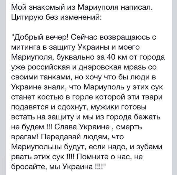 У меня вопрос сторонникам ДНР: Почему, когда Мариуполь был (и остается) украинским, люди из горячих точек находили здесь приют, а сейчас, когда появились слухи о наступлении на Мариуполь "ополченцев", в городе началась паника. Вот вам настоящий референдум